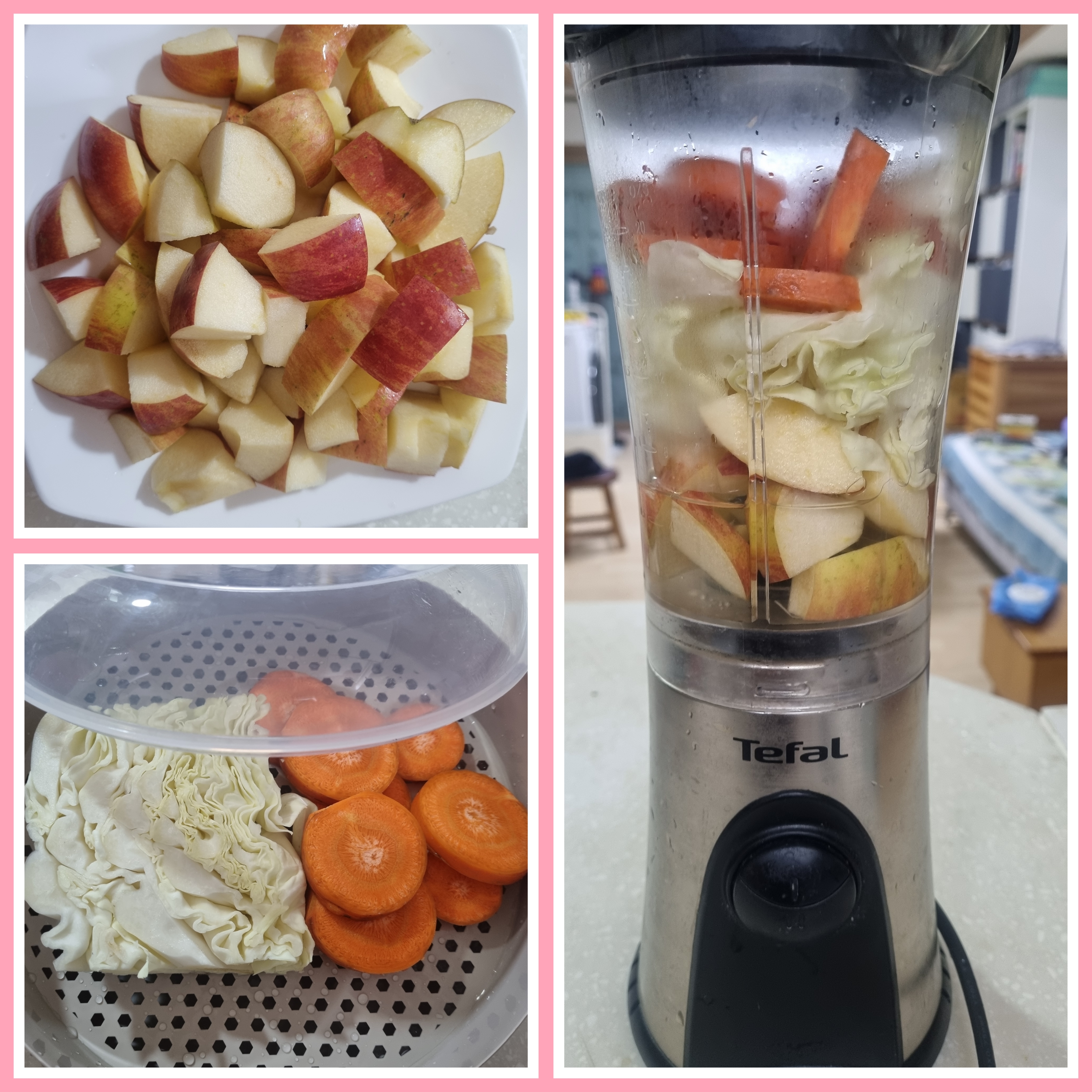 a. 재료손질: 양배추는 깨끗이 씻어 적당히 잘라줍니다. 사과는 껍질째 깨끗이 세척한 후 씨를 제거하고 적당한 크기로 썰어둡니다. 당근도 껍질까지 함께 사용하면 건강에 더 좋습니다. 당근과 양배추는 체내 흡수율을 높이기 위해 살짝 쪄서 준비해 둘 수 있습니다.